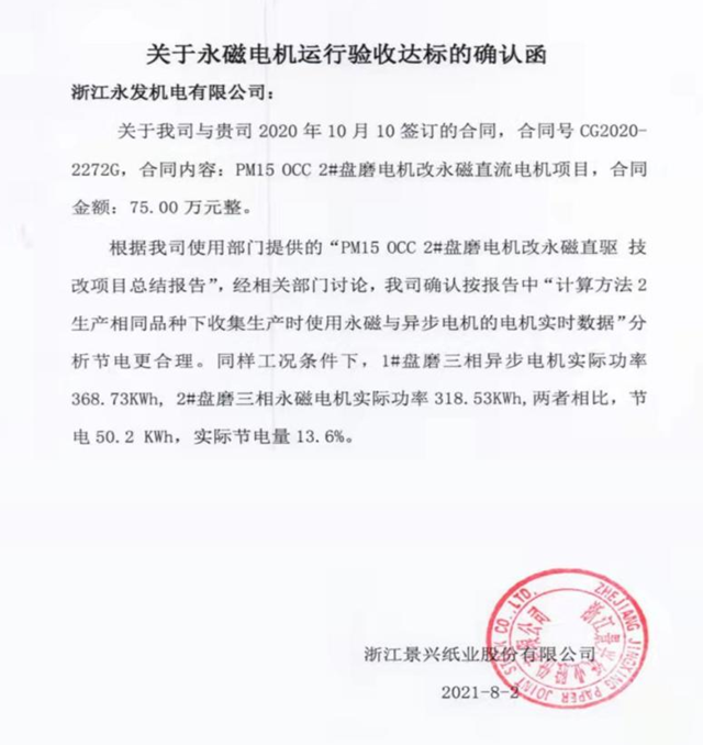10年來永發(fā)先后為造紙、水泥、水利、鋼鐵、印染、軍工等行業(yè),千島湖飲水工程等項目貢獻了大量的高效高低壓電動機、超高效高低壓永磁同步產(chǎn)品,助力節(jié)能減排。其中很多產(chǎn)品都屬于首臺套,永發(fā)機電永磁直驅電機與智能化系統(tǒng)也被水利廳列入新技術推廣目錄。