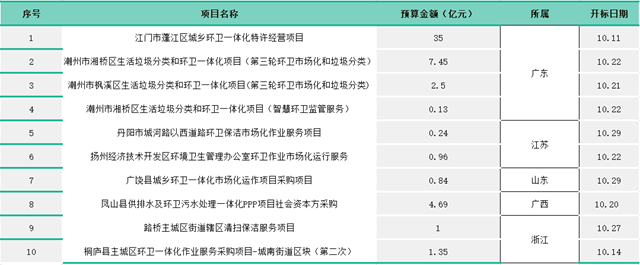 論規(guī)模,有預(yù)算35億的廣東江門(mén)市蓬江區(qū)城鄉(xiāng)環(huán)衛(wèi)一體化特許經(jīng)營(yíng)項(xiàng)目;
