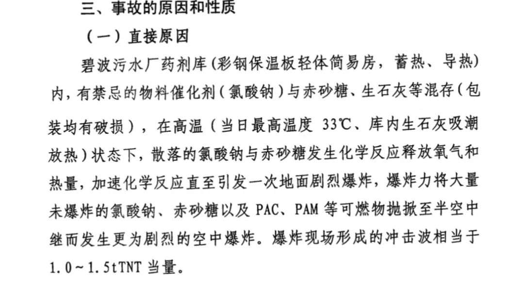 而之所以發(fā)生爆炸,正是與這些氯酸鈉有關(guān)。原來,碧波污水廠的藥劑庫(kù)為彩鋼保溫板輕體簡(jiǎn)易房,容易蓄熱、導(dǎo)熱。由于里面儲(chǔ)存的氯酸鈉、赤砂糖、生石灰等化學(xué)品混存,且包裝均有破損。結(jié)果在高溫的狀態(tài)下,散落的氯酸鈉與赤砂糖發(fā)生化學(xué)反應(yīng),引發(fā)了第一次地面劇烈爆炸。
