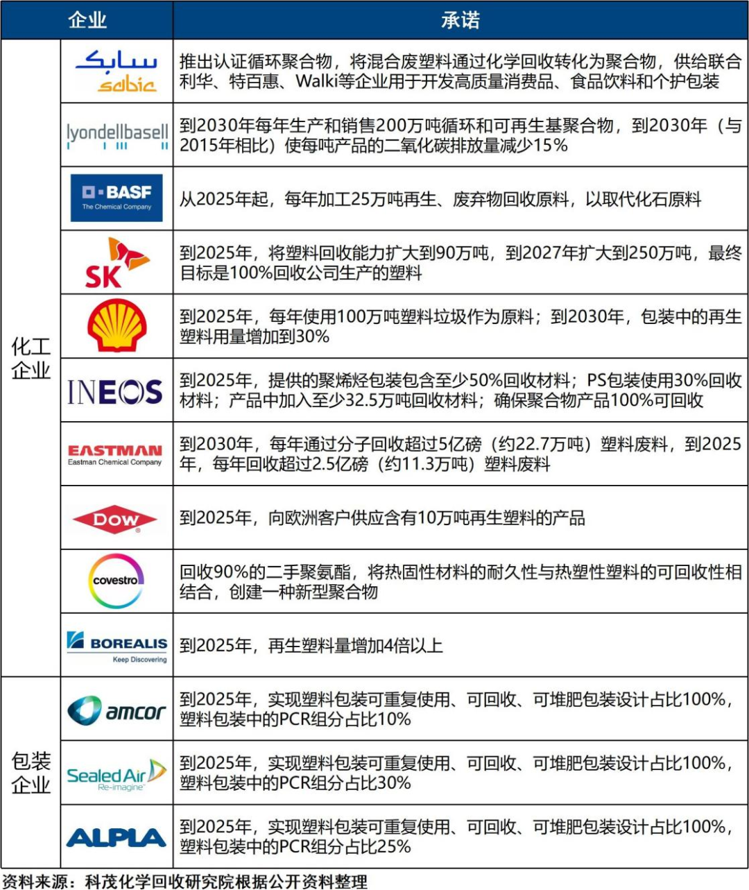 2.以BASF、SABIC、陶氏等化工巨頭為主要成員的40多家國(guó)際企業(yè)建立“終結(jié)塑料廢棄物聯(lián)盟(AEPW)”,承諾投入15億美元,幫助終結(jié)環(huán)境中的塑料垃圾,同時(shí)承諾為客戶(hù)提供PCR塑料。建立和擴(kuò)充PCR塑料產(chǎn)能和產(chǎn)業(yè)鏈,成為近幾年化工巨頭的重要戰(zhàn)略。