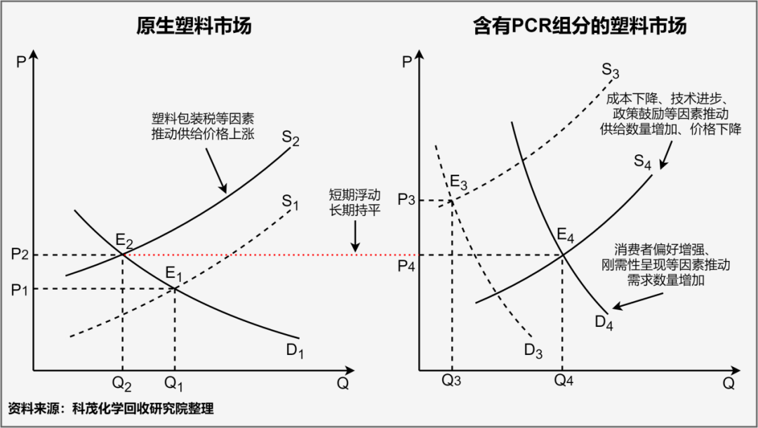 過(guò)去由于化學(xué)回收技術(shù)水平低、生產(chǎn)成本高、政策支持少、市場(chǎng)預(yù)期低等因素,導(dǎo)致PCR塑料供應(yīng)數(shù)量少、價(jià)格高;同時(shí)由于剛性需求尚未呈現(xiàn)、消費(fèi)者偏好不足、替代品(純?cè)芰希﹥r(jià)格低等因素,導(dǎo)致PCR塑料需求數(shù)量少,因此含化學(xué)回收PCR組分塑料市場(chǎng)的理論均衡點(diǎn)E3在現(xiàn)實(shí)中幾乎不存在。近年來(lái)供需要素變化,使含PCR組分塑料的理論均衡價(jià)格從過(guò)去不可接受的程度,下降至現(xiàn)在雖然較高但可以接受的水平。