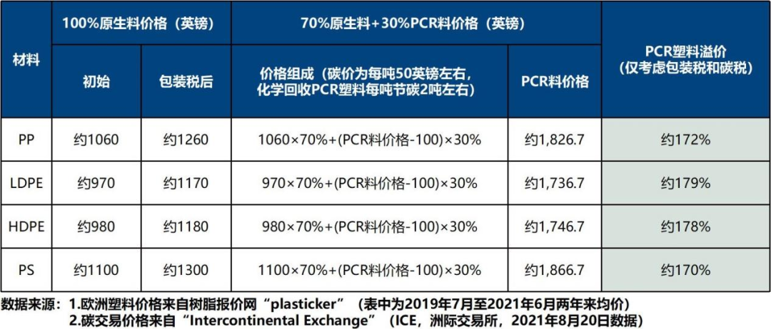 1.塑料包裝稅:以英國(guó)PP產(chǎn)品為例,近兩年來(lái)原生PP產(chǎn)品均價(jià)為每噸1,060英鎊左右,塑料包裝稅對(duì)少于30%再生塑料的包裝征收每噸200英鎊稅款,即每噸原生PP產(chǎn)品使用成本上升到1,260英鎊左右。
