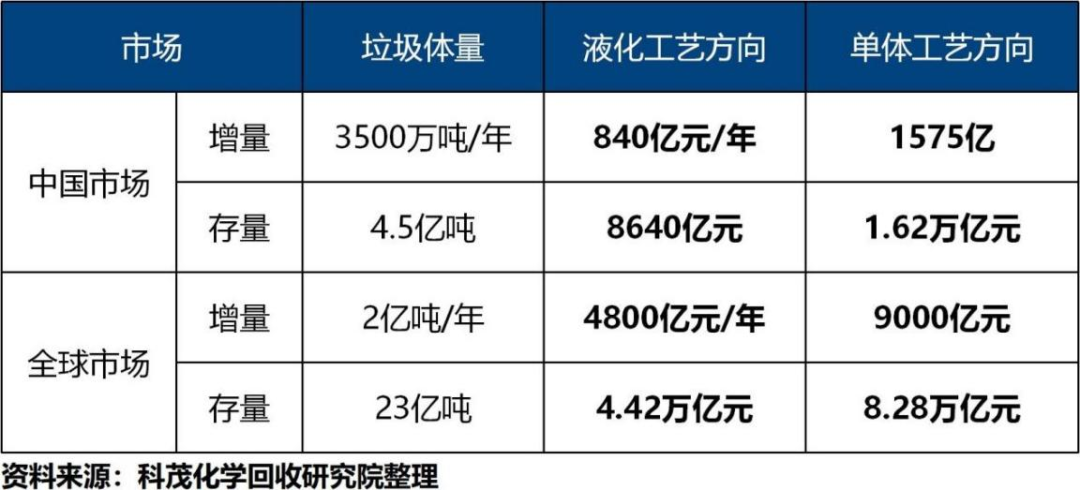 3.廢塑料化學(xué)回收的市場(chǎng)空間巨大,每年新增市場(chǎng)潛力在千億級(jí)別,存量市場(chǎng)在萬(wàn)億級(jí)別。