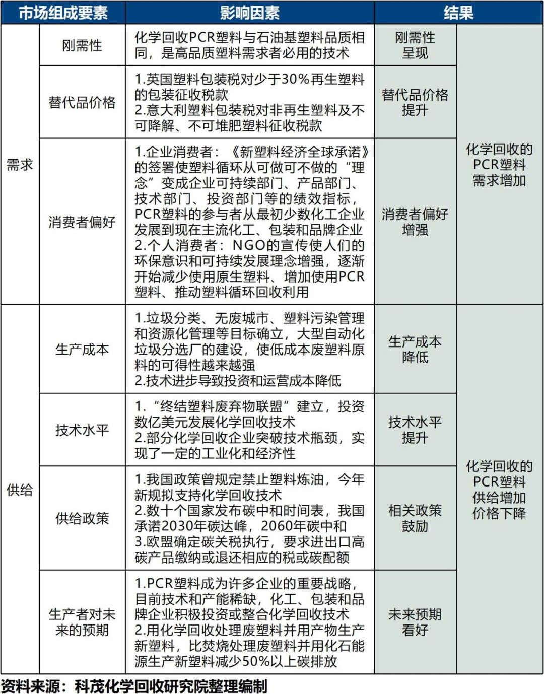 2.近年在政策強(qiáng)力作用下,剛性需求呈現(xiàn)、100%原生塑料稅收增加、消費(fèi)者環(huán)保偏好增強(qiáng),使化學(xué)回收PCR塑料需求大幅增加;技術(shù)水平提升、相關(guān)政策鼓勵(lì)、未來(lái)預(yù)期看好,化學(xué)回收PCR塑料潛在供給能力增加,使化學(xué)回收PCR塑料市場(chǎng)出現(xiàn)并迅速升溫;