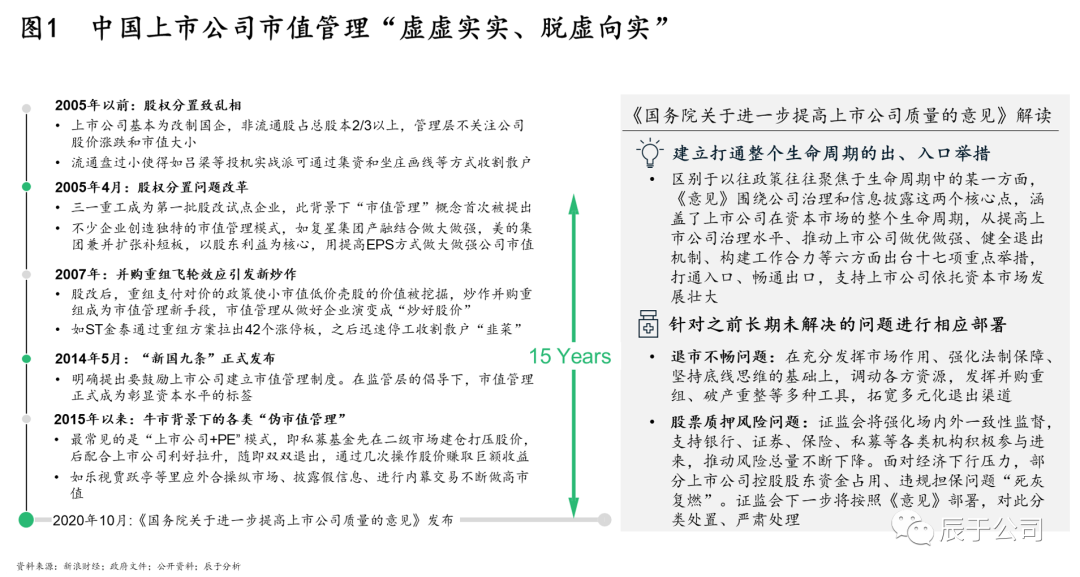 我國于2005年首次提出“市值管理”概念,但以此為名,資本市場長期出現(xiàn)各類“偽市值管理”亂象,包括背后交易拉抬股價、鼓噪并購重組吸引“韭菜”入場等,迫使政策不斷調(diào)整以規(guī)范市場,直到2020年10月,國務(wù)院發(fā)布《關(guān)于進(jìn)一步提高上市公司質(zhì)量的意見》(以下簡稱《意見》),政策上打通了上市公司在資本市場的整個生命周期、部署了之前長期未解決問題的應(yīng)對措施,因而也對上市公司提出了更高要求,市值管理開始“脫虛向?qū)崱保ㄒ妶D1)。
