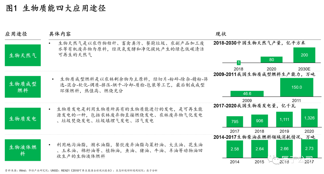 生物質(zhì)能是指太陽(yáng)能以化學(xué)能形式儲(chǔ)存在生物質(zhì)中的能量形式,燒柴火便是對(duì)生物質(zhì)能的利用,自從人類學(xué)會(huì)了使用火,生物質(zhì)能就成為重要的能源來(lái)源之一。現(xiàn)代生物質(zhì)能行業(yè)進(jìn)一步對(duì)各種有機(jī)質(zhì)中的能源進(jìn)行加工和轉(zhuǎn)換,變成各類更易儲(chǔ)存、運(yùn)輸和使用的能源類型,具體可分為四大類別:生物天然氣,生物質(zhì)發(fā)電,生物質(zhì)成型燃料,生物液體燃料。這四類均已有一定的發(fā)展基礎(chǔ)(見(jiàn)圖1)。