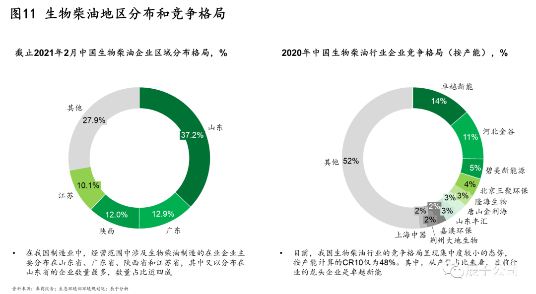 在銷售應(yīng)用上,國(guó)內(nèi)的主要渠道是出口、交通燃料、化工等,出口是拉動(dòng)行業(yè)發(fā)展的主要渠道,2019年出口占產(chǎn)量的比例達(dá)到80%。國(guó)內(nèi)需求的打開(kāi)是行業(yè)發(fā)展的最大希冀,其中最有望打開(kāi)的市場(chǎng)是交通燃料領(lǐng)域——生物柴油強(qiáng)制添加政策。部分城市已經(jīng)開(kāi)始在試點(diǎn),上海市2013年開(kāi)始在公交車上實(shí)行B5標(biāo)準(zhǔn)(添加比例5%)?,F(xiàn)在國(guó)家已開(kāi)始全國(guó)范圍進(jìn)行B5 強(qiáng)制添加標(biāo)準(zhǔn)的意見(jiàn)征求,并有望隨著雙碳目標(biāo)深入推進(jìn)提升到B10。若政策落地實(shí)施,將產(chǎn)生450萬(wàn)噸~1000萬(wàn)噸的產(chǎn)能缺口。