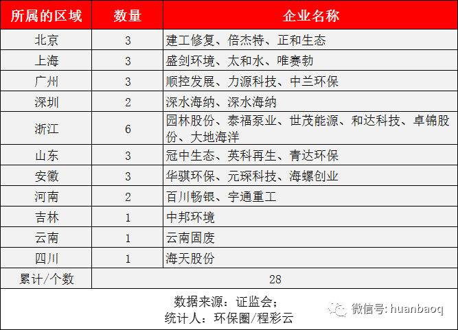 從企業(yè)所屬的業(yè)務(wù)看,今年前三季度擬掛牌/分拆上市的環(huán)企中,不似以往以環(huán)保PPP、BOT工程投資為主的那么多,更多的是做配套、做服務(wù)、做運(yùn)營的技術(shù)裝備企業(yè),僅從名字觀察,還以為跟環(huán)保并不相關(guān)。而事實(shí)上,這些環(huán)保企業(yè)無論是做膜、水泵、生物濾池、勘測設(shè)計(jì)、水質(zhì)監(jiān)測的,還是做水務(wù)信息化、垃圾滲濾液、填埋氣治理、高鹽度工業(yè)廢水治理的,都屬于環(huán)保子領(lǐng)域的細(xì)分分支。這本身也印證了環(huán)保行業(yè)的一個(gè)變化趨勢,就是行業(yè)分工正在越來越細(xì)。上述環(huán)保投行人士表示,縱觀環(huán)保行業(yè)20年發(fā)展史,早期一批靠工程bot項(xiàng)目推動的企業(yè)大多已經(jīng)上市,在資本市場上找到了定位,如業(yè)內(nèi)水務(wù)/供水/固廢的影響力企業(yè)。與此同時(shí),以往那些做配套、輕資產(chǎn)的中小型環(huán)保企業(yè)也獲得了成長,規(guī)模也在變大,再加上注冊制改革放寬了準(zhǔn)入門檻,就給予了這些盈利相對弱、但科技屬性較強(qiáng)的技術(shù)型企業(yè)更多IPO的機(jī)會。▼圖五:28家擬掛牌/分拆上市環(huán)企所從事的業(yè)務(wù)從所屬的地域劃分看,今年掛牌上市的28家企業(yè)中,有11家是北上廣深的企業(yè),數(shù)量與去年持平。這很好理解,北上廣深是一線大都市,政府財(cái)力雄厚,對環(huán)保傾斜力度也大,所以孕育上市企業(yè)的機(jī)會也就更多。不過,隨著環(huán)境治理區(qū)域化、專業(yè)分工精細(xì)化以及長江、黃河流域治理釋放紅利,這種趨勢也在發(fā)生變化,以今年IPO的28家企業(yè)為例,浙江、山東、安徽上市企業(yè)累計(jì)高達(dá)11家。往大了看,這些地區(qū)經(jīng)濟(jì)體量上來了,環(huán)保需求旺盛;往小了說,相對于大都市,企業(yè)在這里建廠、辦公、人力成本也都相對較低。▼圖六:28家擬掛牌/分拆上市企業(yè)總部地點(diǎn)分布創(chuàng)業(yè)板環(huán)企股價(jià)清一色大漲
