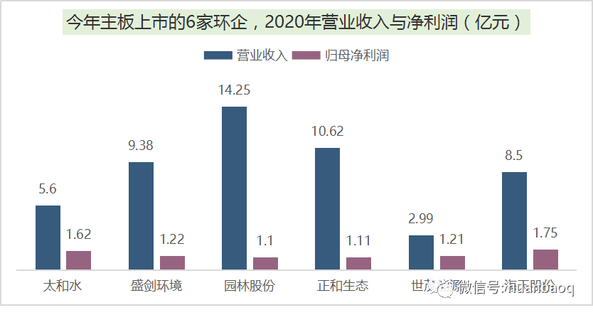 接下來,再說說大家比較關(guān)心的,今年上市企業(yè)的股價(jià)漲幅、最新市值和盈利水平。我們選擇主板、創(chuàng)業(yè)板、科創(chuàng)板上市的企業(yè)分別進(jìn)行對比。今年在主板上市的共有7家企業(yè),分別為太和水、園林股份、海天股份、盛劍環(huán)境、世茂能源、正和生態(tài)和宇通重工,由于宇通重工是通過大股東摘帽變更方式上市而來,暫且不對其進(jìn)行評價(jià)。剩下6家企業(yè)中,根據(jù)10月14日的收盤價(jià),太和水和園林股份竟然跌破發(fā)行價(jià),尤其是太和水,從發(fā)行價(jià)的43.3元/股跌至34.91元/股,總市值蒸發(fā)了近14億元。而同為主板上市的盛劍環(huán)境則表現(xiàn)極佳,這家從事半導(dǎo)體廢氣治理、煙氣凈化的公司,在國內(nèi)半導(dǎo)體產(chǎn)業(yè)大發(fā)展背景下,股價(jià)從19.87元/股漲至56.73元/股,總市值升至70.3億元,成為今年主板上市市值最高環(huán)保企業(yè)。這6家主板上市環(huán)企,2020實(shí)現(xiàn)營業(yè)收入大多位于5億元-14億元之間,歸母凈利潤也大多在1億元-2億元,營收最高的是杭州園林股份的14.25億元,凈利最高的則是成都海天股份的1.75億元。自上市以來,海天股份動作頻頻,半年前還收購了新開元等4座污水廠,然后又?jǐn)M與康恒合資開公司,開拓四川垃圾焚燒/固廢業(yè)務(wù)。▼圖七:6家主板上市環(huán)企,2020年?duì)I收與凈利潤相對于主板上市企業(yè)的表現(xiàn)平平,今年10家在創(chuàng)業(yè)板上市的環(huán)企,股價(jià)清一色迎來大增,從8元-9元小盤股漲至20元-40元的中小型股,大多翻了2倍,或許跟創(chuàng)業(yè)板估值起飛有關(guān)。其中,百川暢銀(垃圾填埋氣發(fā)電)和倍杰特(高鹽度工業(yè)廢水治理)值得一說,不是由于股價(jià)翻了幾翻,而是在于它們卓越的賺錢能力。相較于其他上市環(huán)企的幾千萬凈利,去年在飽受疫情沖擊的情況下,這兩家企業(yè)的凈利潤竟然都過了億,比老牌上市企業(yè)盈利能力還要強(qiáng)。▼圖八:10家創(chuàng)業(yè)板上市環(huán)企,2020年凈利潤排行接著,我們再看科創(chuàng)板,相對于去年的11家,今年科創(chuàng)板上市的環(huán)企只有7家,分別是英科再生、和達(dá)科技、青達(dá)環(huán)保、力源科技、卓錦股份、元琛科技、唯賽勃。這7家企業(yè),除了英科再生(塑料回收再生)2020年歸母凈利潤遙遙領(lǐng)先之外,其余幾家凈利潤都在幾千萬左右。值得一提的是膜企唯賽勃,去年?duì)I收和凈利潤雙雙下滑,其中凈利潤下滑30%至4674萬元,這也從側(cè)面說明了科創(chuàng)板企業(yè)過會門檻相對較低。▼圖九:7家科創(chuàng)板上市環(huán)企,2020年凈利潤排行