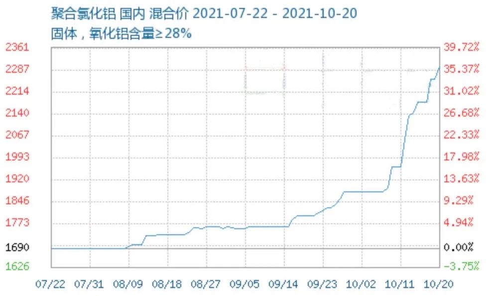 一起上漲的還有同樣的替代品,例如聚合氯化鋁在10月上半月上漲17%左右,主要原因是上游原材料鹽酸企業(yè)檢修增多,供應(yīng)減少,下游采購積極性加強(qiáng),市場供不應(yīng)求,導(dǎo)致鹽酸價(jià)格偏緊。