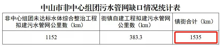 ▼截至2021年8月,中山市非中心組團(tuán)污水管網(wǎng)缺口達(dá)到1535公里