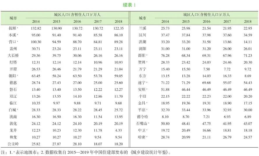 為了獲得收縮型城市的生活垃圾產(chǎn)生特征,首先對全國地級市、縣級市進(jìn)行了總體分析。收縮型城市目前還缺乏統(tǒng)一定義,本研究從生活垃圾管理角度出發(fā),根據(jù)我國《城鄉(xiāng)建設(shè)統(tǒng)計年鑒》,以城區(qū)人口(含城區(qū)暫住人口)在2013—2018年間持續(xù)減少超過5%為基本衡量依據(jù)??紤]到統(tǒng)計口徑的差異,進(jìn)一步參考各地的統(tǒng)計公報與年鑒,排除人口顯著流入的城市,得到典型收縮型城市共計49個,如表1~表3所示。表1~表3中,有些地級市和縣級市為隸屬關(guān)系,但這些地級市的統(tǒng)計數(shù)據(jù)均對應(yīng)主城區(qū),并不包含下轄縣級市城區(qū)的人口或垃圾量。
