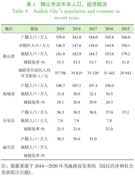 根據(jù)當(dāng)?shù)亟?jīng)濟(jì)和社會發(fā)展公報(表4),鞍山市的總戶籍人口和城鎮(zhèn)人口都呈現(xiàn)緩慢減少的趨勢,而城鎮(zhèn)化率近幾年保持在53%左右。在鞍山市內(nèi)部,存在鄉(xiāng)村人口逐漸向縣城(海城、臺安、岫巖)遷移,而縣城人口逐漸向鞍山市區(qū)遷移的趨勢。根據(jù)近幾年的趨勢,按戶籍人口每5 a減少2%估計,則鞍山市2030年戶籍人口為326萬人,城鎮(zhèn)化率達(dá)到60%。