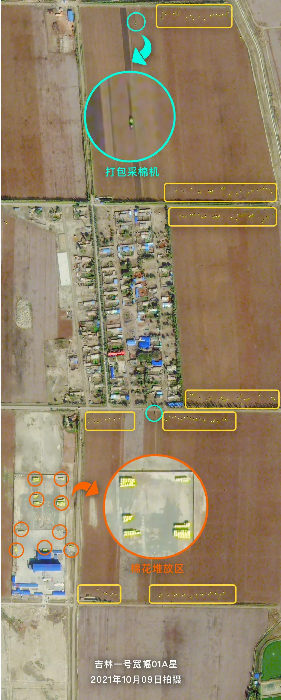 金秋時節(jié),新疆各地棉花陸續(xù)進入采收期。吉林一號衛(wèi)星從太空記錄下了新疆昌吉回族自治州阜康市機械化采收棉花的忙碌場景,壓縮打包完成的棉花卷堆積在棉田周圍,正在等待運輸。