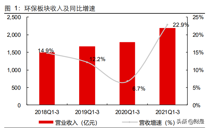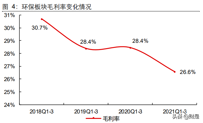 利潤表:收入、利潤同比增速均超20%,近兩年收入復合增速為14.8%2021Q1-Q3環(huán)保板塊實現(xiàn)營收2311億元,同比增23.3%;歸母凈利潤232.3億元,同比增20.8%;扣非歸母凈利潤203.3億元,同比增17.6%;毛利率同比降 1.8pct至27.1%。環(huán)保行業(yè)基本擺脫疫情負面影響,收入、利潤增速等成長性指標表現(xiàn)向好,營收同比增速排序分別為檢測(35.5%)、水(工程設備)(31.1%)、水務運營(29.7%)、固廢(20.4%)、節(jié)能(19.0%)、大氣(17.1%)、監(jiān)測(4.6%),各子行業(yè)收入增速均恢復正增長。工程、服務類業(yè)務,去年受疫情影響較重,故檢測、水(工程設備)恢復較為顯著;固廢、水務運營主要是運營業(yè)務為主,剛需性強,同時疊加行業(yè)具備成長性,故主要是自身成長性的體現(xiàn),水務存在個股影響;其余板塊需求變化不大,也在穩(wěn)步增長。