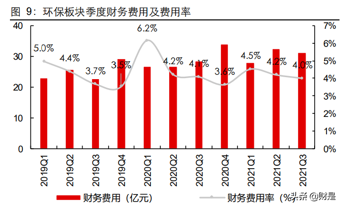 費用端得到控制:2021Q1-Q3環(huán)保板塊期間費用累計支出為361.8億元,同比增14.6%, 期間費用率同比降1.2pct至15.7%。費用率方面,銷售費用率 2.8%,同比降0.41pct;管理費用(含研發(fā)費用,下同)率8.8%,同比降 0.37pct;財務費用率4.1%,同比降0.41pct。期間費用率同比下行的主要原因是:疫情后,收入同比大幅增長23.3%,致期間費用率顯著下行。2021Q1-Q3期間費用增速分別為:檢測同比增31.3%,期間費用率同比降 1.1pct至33.6%;水務運營同比增20.4%,期間費用率同比降1.1pct至14.7%;監(jiān)測同比增17.8%,期間費用率同比增4.8pct至42.5%;固廢同比增15.0%,期間費用率同比降0.55pct至11.8%;大氣同比增10.3%,期間費用率同比降 0.88pct至14.4%;水(工程設備)同比增9.6%,期間費用率同比降 4.0pct 至 20.5%;節(jié)能同比增2.4%,期間費用率同比降2.2pct 至 13.8%。