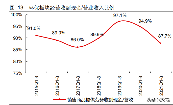 現(xiàn)金流量表:收入快速增長致收現(xiàn)比下行,投融資數(shù)據(jù)環(huán)比回暖2021Q1-Q3 環(huán)保板塊銷售商品收到現(xiàn)金/營收比率(收現(xiàn)比)為 87.7%,同比降 7.2pct,處于歷史數(shù)據(jù)區(qū)間內(nèi);經(jīng)營活動、投資活動及籌資活動產(chǎn)生的現(xiàn)金流量凈額分別 151 億 元(去年同期為 206 億元,同比降 27%)、-526 億元(去年同期為-680億元,凈支出同 比減少 23%)和 197 億元(去年同期為 540 億元,同比降 64%)。收入快速上行致收現(xiàn)比下降,并非回款惡化。環(huán)保行業(yè)收入存在收款周期,而收入的快速上行致當期收現(xiàn)比下降,并非行業(yè)回款惡化。行業(yè)經(jīng)歷過2018年 PPP 現(xiàn)金流風險后,各公司重視回款,推動 PPP 項目轉(zhuǎn)EPC模式,工程、設備銷售等業(yè)務控制客戶質(zhì)量,并強化前期應收賬款回款等,使得行業(yè)現(xiàn)金流好轉(zhuǎn),結合前文對應收賬款的討論,也可證明回款在向好。