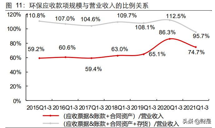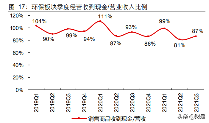 2021Q1-Q3環(huán)保板塊籌資活動現(xiàn)金流凈額為197億元,同比降 64%,行業(yè)融資帶有階段性,2020 年同期籌資活動現(xiàn)金流凈額為 540 億元,同比增 163 億元,故推測為2021年籌資活動相對較弱的主要原因。而水(工程設備)方向的融資規(guī)模持續(xù)受控,同比減少90億元。2021Q3環(huán)保板塊銷售商品等收到現(xiàn)金/營收比率為86.7%,環(huán)比增5.6pct,同比降 6.7pct, 主要原因為2021Q3收入同比增11.6%,而收入本身存在賬期,故造成收現(xiàn)比同比下行;環(huán)比在收入基本相當?shù)那闆r下,實現(xiàn)改善,說明回款良好。
