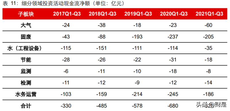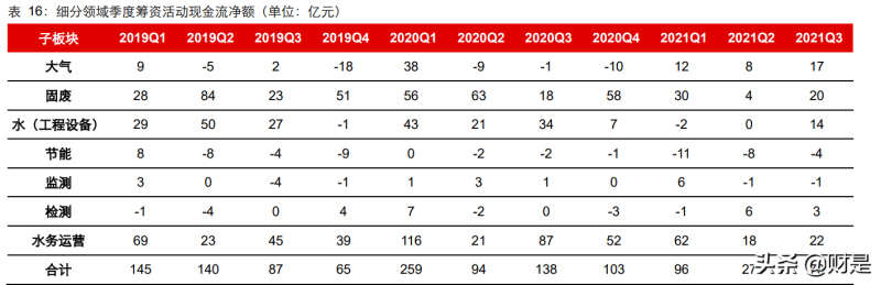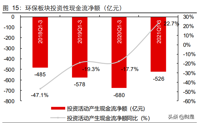 水務出現(xiàn)下行,主要是首創(chuàng)環(huán)保/中原環(huán)保/聯(lián)泰環(huán)保因業(yè)務需要,備貨增加,經(jīng)營活動現(xiàn)金流出同比增加20.6/19.7/5.7億元,造成下行。2021Q1-Q3環(huán)保板塊投資活動凈支出同比降 23%達 526 億元,主要是水(工程設備)方向的投資性凈支出大幅下降,2021Q1-Q3 的支出為 35 億元,遠低于2020Q1-Q3 的 114 億元;而固廢、水務運營板塊的投資活動現(xiàn)金流凈支出分別達205/186億元,同比存在一定程度下降,但仍保持了相當規(guī)模,與該兩個方向仍處于成長期有關,預計資本開支的需求將維持;投資活動現(xiàn)金流也反映了資金投向的項目整體質(zhì)量有所提升。