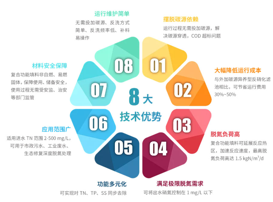 而通過對復(fù)合活性生物載體中硫、鐵及其他活性組分進(jìn)行優(yōu)化設(shè)計,則能促使附著其上的功能微生物形成代謝偶聯(lián)網(wǎng)絡(luò),實現(xiàn)高生物持有量、長距離電子傳遞,進(jìn)而獲得高負(fù)荷脫氮能力,徹底擺脫對碳的依賴。▼SADeN®技術(shù)8大核心優(yōu)勢