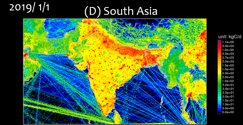 ▲圖3展示了全球四大重點(diǎn)排放區(qū)域的碳排放實(shí)時(shí)動(dòng)態(tài)變化(A.東亞地區(qū),B.美國(guó)主體,C.歐洲,D.南亞)