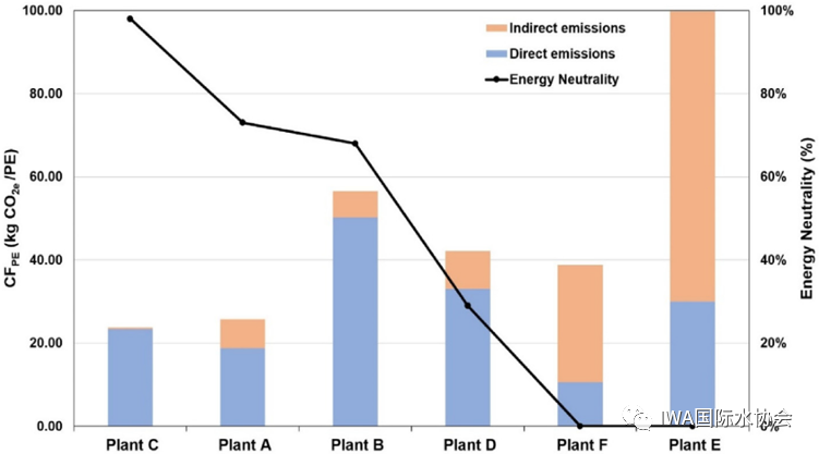下圖展示的是6個(gè)污水廠的能量回收水平及其人口當(dāng)量碳足跡的比較結(jié)果。結(jié)果顯示,能量中和與碳足跡值沒有直接相關(guān)性,但是通過回收沼氣提高能量回收的可以減少非間接碳排放所占的比值。污水廠E的能量回收率為0%,非間接排放高達(dá)69%,而污水廠C的能量回收率為98%,碳足跡(CF)則只有1%。