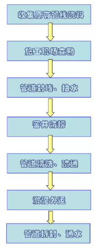 管道檢測→修復(fù)管安裝→將修復(fù)器導(dǎo)→連接充氣裝→撤出修補(bǔ)器