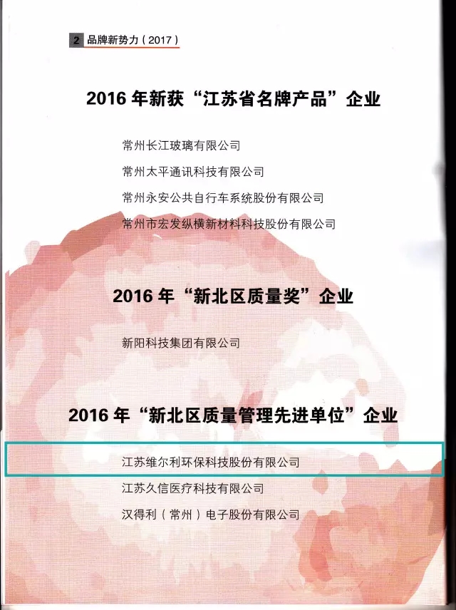 在《常州市新北區(qū)黨政辦公室關(guān)于印發(fā)常州市新北區(qū)深化商標(biāo)品牌戰(zhàn)略行動(dòng)計(jì)劃(2017-2019)的通知》(常新委辦〔2017〕111號)文件中,提出深化商標(biāo)品牌戰(zhàn)略建設(shè),將維爾利環(huán)保作為常州市新北區(qū)馳名商標(biāo)重點(diǎn)培育企業(yè),實(shí)施“產(chǎn)業(yè)品牌提升”工程,打響產(chǎn)業(yè)品牌特色優(yōu)勢,培育細(xì)分行業(yè)新品牌。