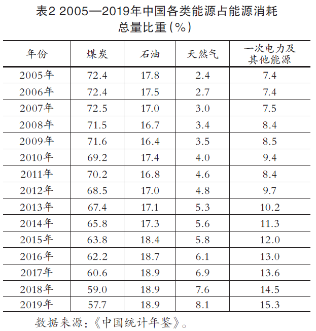 近年來,中國一次能源消費(fèi)結(jié)構(gòu)呈現(xiàn)出明顯的低碳化、清潔化趨勢(shì)(見表2)。2005—2019年煤炭消費(fèi)量比重從72.4%下降至57.7%,共下降14.7個(gè)百分點(diǎn);天然氣消費(fèi)量則從2.4%提高到8.1%,清潔能源(一次電力及其他能源)消費(fèi)量從7.4%提高到15.3%,合計(jì)占比提高13.6個(gè)百分點(diǎn)。
