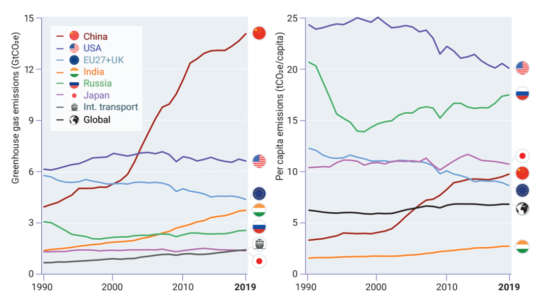 1990-2019年典型國家碳排放量和人均排放強度 來源:Emissions Gap Report 2020