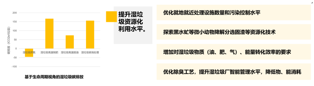 從生命周期視角估算,不同濕垃圾處理工藝碳排放差異較大,但是高能耗普遍是各類工藝優(yōu)化的重點。建議因地制宜選取處理工藝的同時,進一步提升濕垃圾資源化利用水平。