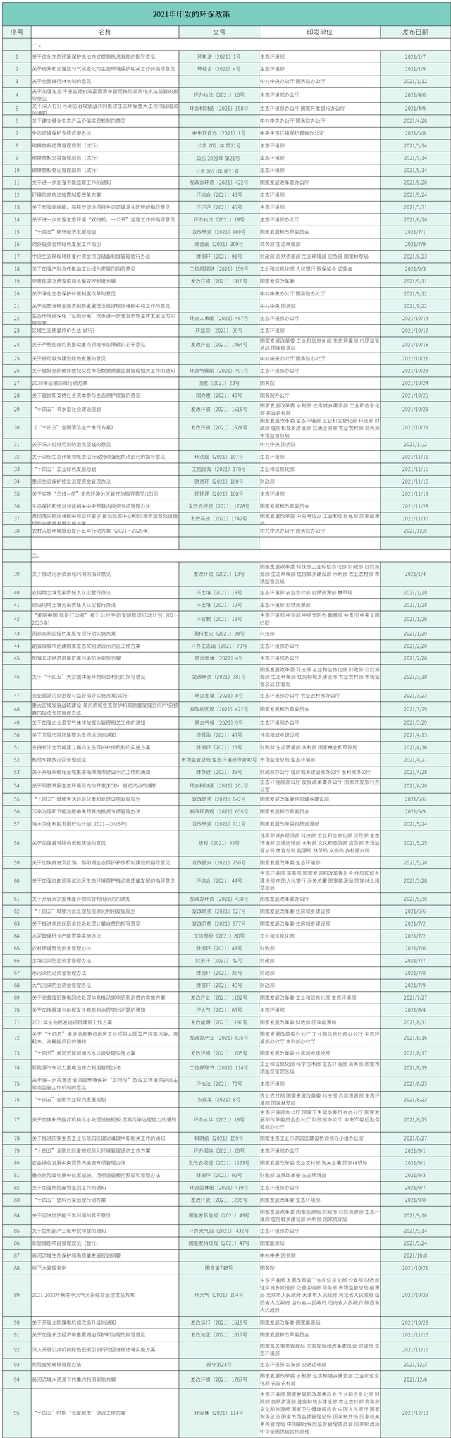 據(jù)環(huán)保在線初步統(tǒng)計(jì),2021年至今(數(shù)據(jù)截至2021年12月20日),已經(jīng)有95項(xiàng)環(huán)保政策法規(guī)出臺。