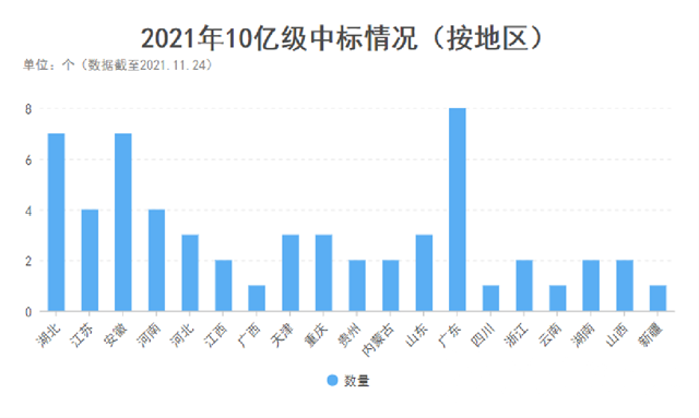 而從區(qū)域來看,廣東、湖北、安徽10億+標(biāo)的數(shù)量名列前三,江蘇、河南、河北、天津、重慶、山東等也有數(shù)個10億+標(biāo)的被拿下,區(qū)域市場熱度可見一斑。
