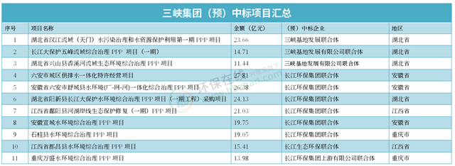 上表中可以清晰地看到,11個(gè)項(xiàng)目均以聯(lián)合體方式中標(biāo),長(zhǎng)江環(huán)保集團(tuán)中標(biāo)的項(xiàng)目占多數(shù),共計(jì)8個(gè),金額占到167.54億元,占比超77%。項(xiàng)目主要對(duì)長(zhǎng)江流域的水生態(tài)環(huán)境進(jìn)行治理。
