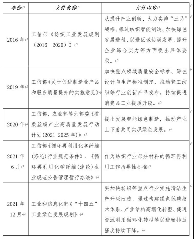 國家政策層面,自2016年起工信部聯(lián)合各部委陸續(xù)發(fā)布多個工業(yè)、制造業(yè)高質(zhì)量發(fā)展實施意見,其中多次提到紡織行業(yè)作為重要領(lǐng)域,要加快綠色制造、綠色設(shè)計,推動行業(yè)循環(huán)再利用,促進(jìn)行業(yè)高質(zhì)量綠色發(fā)展。