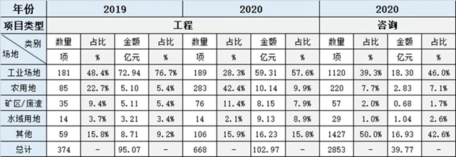 2019-2020年工程及咨詢項(xiàng)目不同用地類型的項(xiàng)目數(shù)量和項(xiàng)目金額分析