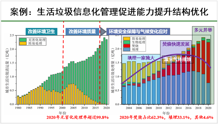 產(chǎn)生多少固廢都不清楚的情況下怎么計(jì)算減碳?劉建國(guó)表示,固廢治理首先需要借助新一代信息化技術(shù)把底數(shù)摸清楚。城市生活垃圾板塊就做了很好的示范,數(shù)據(jù)從過去的粗放狀態(tài)到近年越來(lái)越逼近真實(shí),數(shù)據(jù)呈現(xiàn)也越來(lái)越清晰。2020年城市生活垃圾無(wú)害化處理率超過99.8%,其中焚燒占比62.3%,填埋33.1%,其他4.6%,城市生活垃圾處理方式從填埋一家獨(dú)大到焚燒快速發(fā)展再到現(xiàn)在多元并舉,管理水平的提升帶來(lái)了垃圾處理方式的進(jìn)步,從最初環(huán)境衛(wèi)生問題的解決到環(huán)境質(zhì)量問題的解決,再到現(xiàn)在環(huán)境安全問題和氣侯變化的應(yīng)對(duì),其中精細(xì)化管理和信息化管理發(fā)揮了很重要的作用。