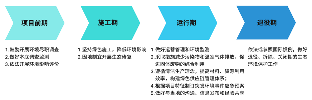與2013版相比,2022版《指南》延續(xù)了2021版《工作指引》所鼓勵的“全周期”管理的精神,針對對外投資合作建設(shè)項目全生命周期中的每一個階段,包括項目前期、施工期、運行期、退役期,都提出了具體的要求(見圖3)。其中,對每個階段的指引不僅涉及了污染防治、應(yīng)對氣候變化、生物多樣性保護等多維度,而且對標了國際通行規(guī)則標準或中國更嚴格標準。
