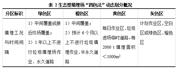 垃圾填埋場(chǎng)的生命周期主要分為三個(gè)階段:建設(shè)階段、運(yùn)行階段和封場(chǎng)修復(fù)階段。垃圾填埋場(chǎng)應(yīng)根據(jù)《生活垃圾衛(wèi)生填埋場(chǎng)處理工程項(xiàng)目建設(shè)標(biāo)準(zhǔn)》(建標(biāo)124-2009)建設(shè),建設(shè)項(xiàng)目主要包括填埋場(chǎng)主體工程與設(shè)備、配套工程和生產(chǎn)管理與輔助設(shè)施及生活服務(wù)設(shè)施等,建設(shè)完成后進(jìn)入運(yùn)行階段。衛(wèi)生填埋場(chǎng)運(yùn)行管理應(yīng)符合《生活垃圾填埋場(chǎng)運(yùn)行管理規(guī)范》(DB11/T 270-2014)。在運(yùn)行階段,生態(tài)型填埋場(chǎng)采用 “四色法”(國(guó)作登字-2020-L-01092309)對(duì)填埋場(chǎng)進(jìn)行動(dòng)態(tài)劃分,即綠色區(qū)、黃色區(qū)、灰色區(qū)和橙色區(qū),詳見表2。