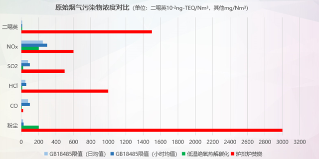 羅宇煊用云南水務(wù)在昆明周邊的兩個200噸級的垃圾處理廠的真實數(shù)據(jù),對低溫絕氧熱解碳化技術(shù)和爐排焚燒技術(shù)的主體布局、爐腔溫度、廠區(qū)工藝、煙氣處理和原始煙氣污染物濃度作了進一步的對比。