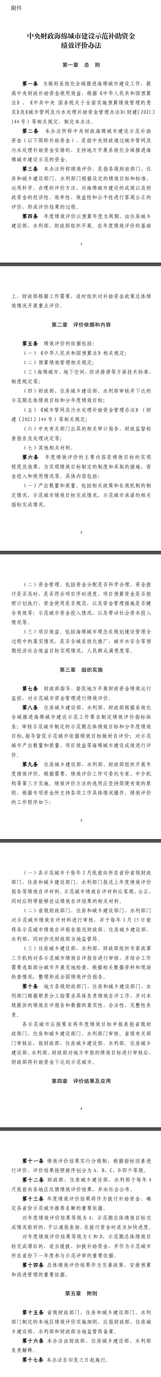 為做好系統(tǒng)化全域推進海綿城市建設(shè)工作,提高中央財政補助資金使用效益,根據(jù)《中華人民共和國預(yù)算法》《中共中央 國務(wù)院關(guān)于全面實施預(yù)算績效管理的意見》及《城市管網(wǎng)及污水處理補助資金管理辦法》(財建〔2021〕144號)等相關(guān)規(guī)定,我們制定了《中央財政海綿城市建設(shè)示范補助資金績效評價辦法》,詳見附件。