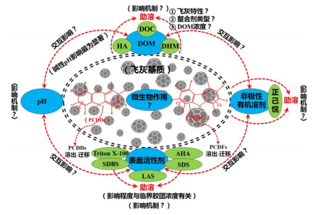 相關(guān)研究表明,溶解性有機(jī)物(DOM):如DOC(溶解性有機(jī)碳),DHM(溶解性腐殖類(lèi)物質(zhì))和HA(腐殖酸類(lèi))等、pH、表面活性劑、非極性有機(jī)溶劑和微生物作用對(duì)飛灰中二噁英的溶出均有一定的影響。填埋處置環(huán)境中影響飛灰中PCDD/Fs溶出的主要因素及其相互作用關(guān)系如圖2所示。 圖2 填埋處置環(huán)境中影響飛灰中PCDD/Fs溶出的主要因素及其相互作用關(guān)系