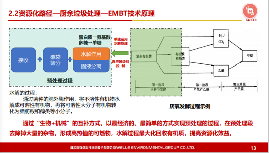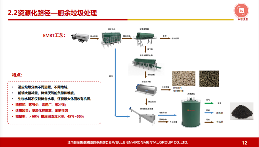 對于有機廢棄物的原料及核心技術(shù),可以說從城市有機廢棄物到農(nóng)村有機廢棄物,現(xiàn)在最核心的還是通過厭氧發(fā)酵技術(shù),最終通過沼氣化利用,達到無害化或者是環(huán)?;俦M可能實現(xiàn)資源化。國家發(fā)改委推出了一百個餐廚垃圾處理試點項目,之后進行全方位地推出。在國內(nèi)真正運行好的餐廚垃圾項目并不是特別多,主要工藝還是以厭氧為主。為什么這塊資源化的效率會好一些?尤其在“碳減排”的壓力下,使得出口價格一直比較好,這個行業(yè)最近稍微能夠掙點錢。另外,更深度的資源化利用,比如做有機質(zhì),食用的昆蟲養(yǎng)殖,也會有一些收益,再加上沼氣的收益。對于餐廚垃圾處理,我認為如果到了一定規(guī)模,收益還是不錯的。相對來說,廚余垃圾的資源化利用效率會差一些?,F(xiàn)在全國都在推行垃圾分類,不同城市廚余垃圾的質(zhì)量相差比較大。如上海的廚余垃圾含水率、油脂含量與餐廚垃圾是有一點類似的,含油量可能稍微小一點,但在其他城市就相差非常大。廚余垃圾資源化是節(jié)省能源化的利用,以無害化為主,有一些也可以做食用昆蟲的養(yǎng)殖。 對于濕垃圾或者是廚余垃圾,我們特別推出一款技術(shù)——EMBT技術(shù)。結(jié)合生物水解技術(shù),原理是有機廢棄物或者有機物在厭氧發(fā)酵過程當中主要是通過酸化水解以及產(chǎn)甲烷兩個階段,我們通過設(shè)施化的反應器,把酸化水解在前面就能夠作為預處理,真正地溶解到水下面的有機物再到厭氧處理,這樣使得厭氧反應器不要那么復雜,剩下的固渣資源化也會比較方便,去做水量化的利用都是可行的。這個工藝現(xiàn)在在上海包括在紹興做下來,還是受到比較多的認可。