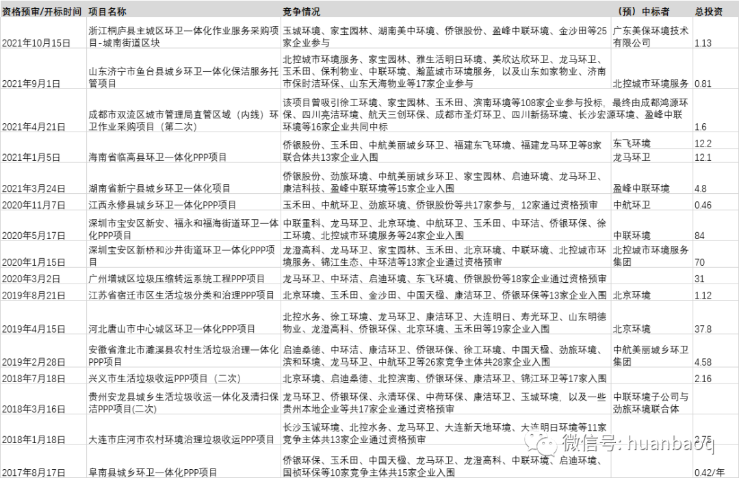 ▼表2 2017年至今部分競爭激烈的環(huán)衛(wèi)項目列表