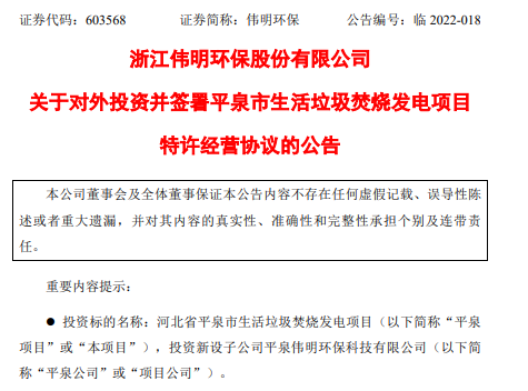 偉明環(huán)保投資并簽署簽訂平泉市生活垃圾焚燒發(fā)電項(xiàng)目特許經(jīng)營(yíng)協(xié)議