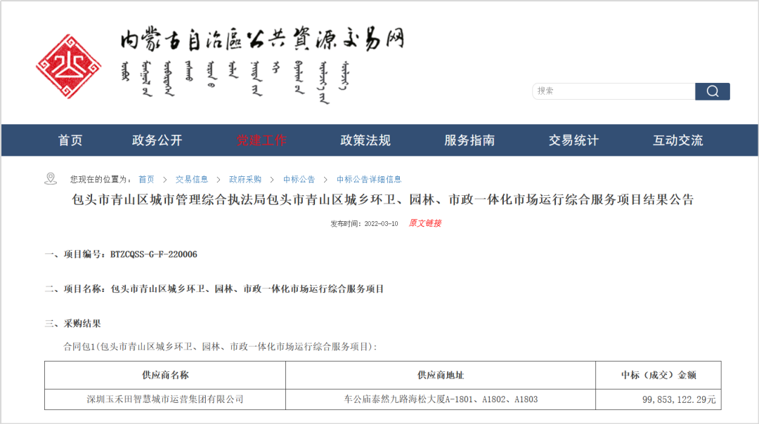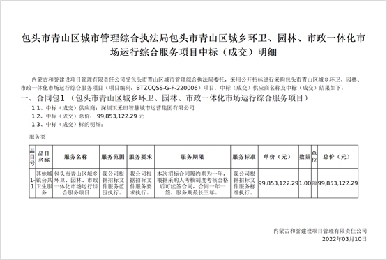 內(nèi)蒙古自治區(qū)政府采購網(wǎng)、內(nèi)蒙古自治區(qū)公共資源交易網(wǎng)消息,2022年3月10日,包頭市青山區(qū)城鄉(xiāng)環(huán)衛(wèi)、園林、市政一體化市場運(yùn)行綜合服務(wù)項目開標(biāo)。