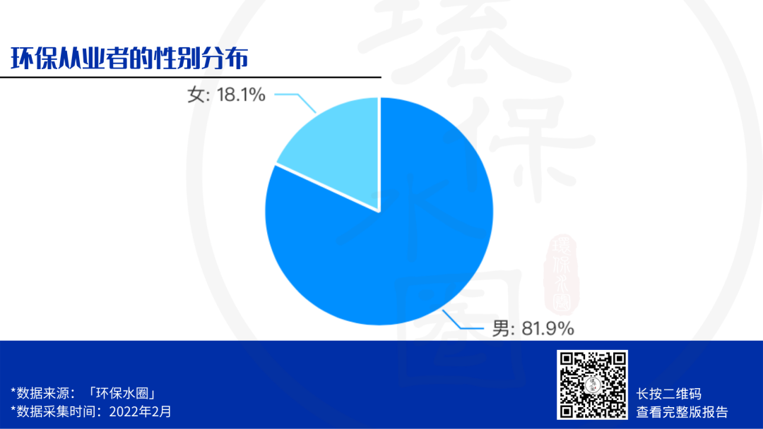 本次調(diào)查發(fā)現(xiàn),環(huán)保從業(yè)群體中男女比例為81.9%:18.1%,接近5:1,與我們?cè)?021年調(diào)查的結(jié)果相比,女性環(huán)保從業(yè)者的比例提升了1.5%~2%,這是一個(gè)非??上驳默F(xiàn)象,希望越來越多的小仙女兒們能加入環(huán)保的隊(duì)伍中來,男女搭配,干活不累!