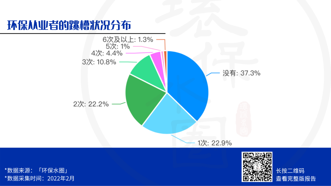 根據(jù)統(tǒng)計(jì)我們可以看到,沒有過跳槽經(jīng)歷的環(huán)保人占整個(gè)群體的37.3%;跳槽1-3次的占比過半,為55.9%;跳槽4次的占比為4.4%;而跳槽5次的占比為1%;跳槽6次及以上的占比1.3%。