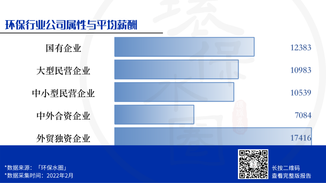 從數(shù)據(jù)中我們還可以看到,有23.8%的環(huán)保人工作在國(guó)企,有14.9%的環(huán)保人工作在中外合資或外商獨(dú)資的企業(yè)中,整體占比并不高。