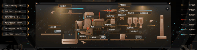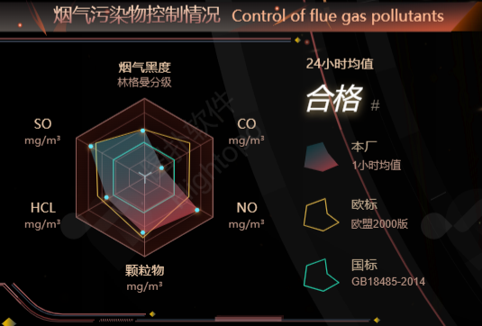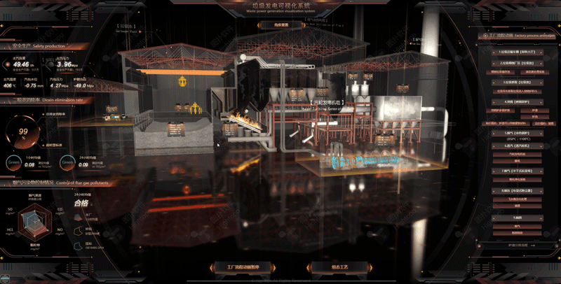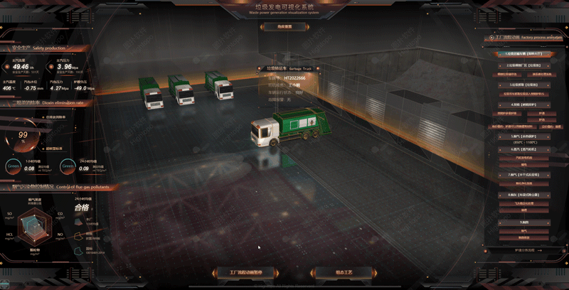 HT 左側(cè)面板循環(huán)播放煙氣污染物控制情況、二噁英消除率、以及安全生產(chǎn)關(guān)鍵指標(biāo)等。
